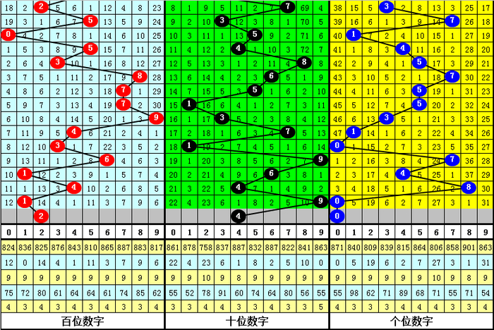 十位上期奖号为:热号9,最近十位主要为温号,冷号开出次数相对较低,该位目前有5个热号:1、4、6、7、9,本期预计该位开出热号,注意号码4再出。
