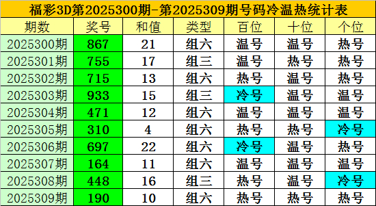 上期回顾:福彩3D第2025309期开奖奖号为:190,奖号类型为:组六,奖号冷温热态为:热号+热号+热号。